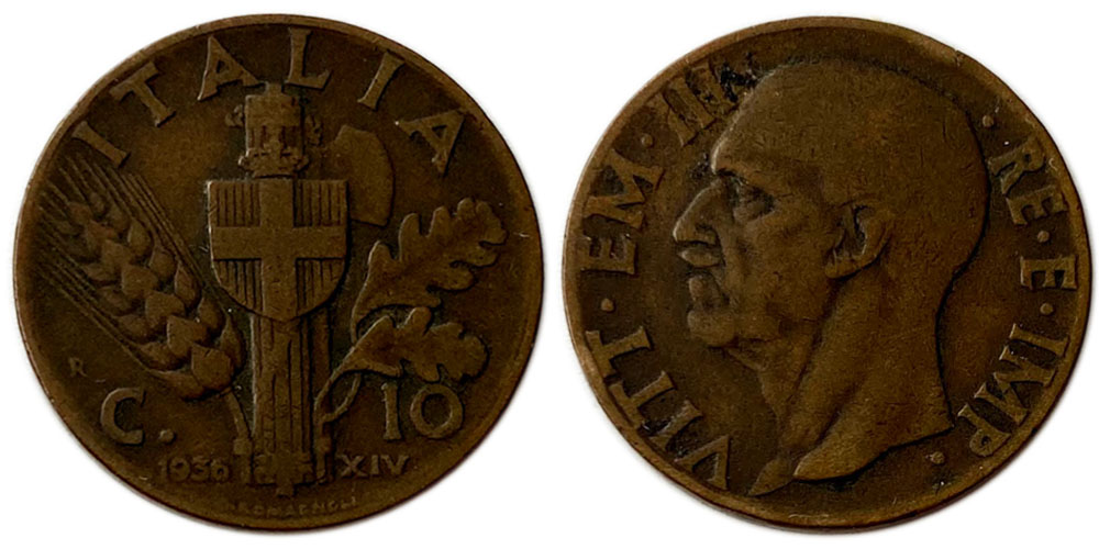 10 чентезимо 1936 Италия – Новый реверс: Герб
