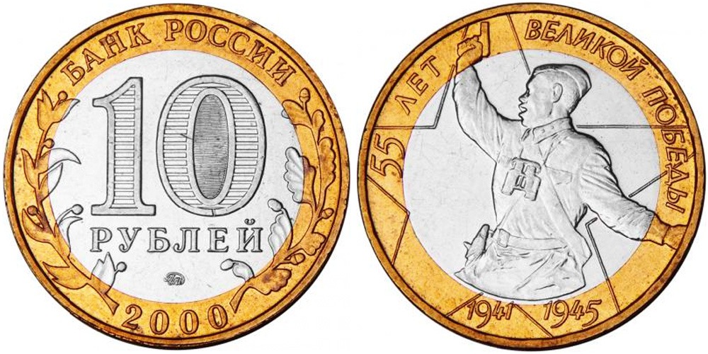 10 рублей 2000 Россия – 55 лет Победе в Великой Отечественной войне 1941-1945 гг – ММД