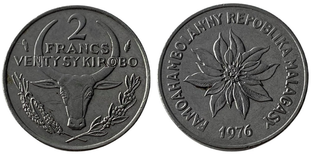 2 франка 1976 Мадагаскар – Пуансеттия прекраснейшая или молочай прекраснейший