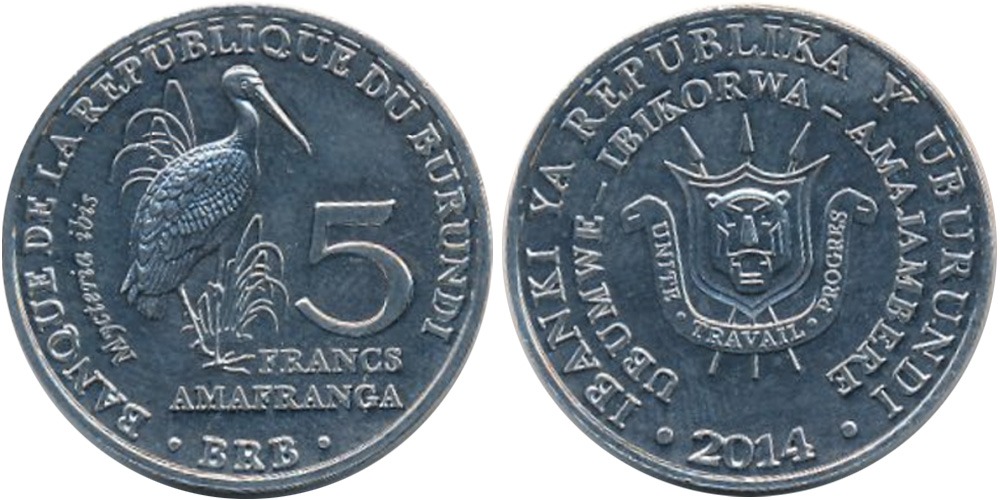 5 франков 2014 Бурунди – Mycteria ibis – Африканский клювач